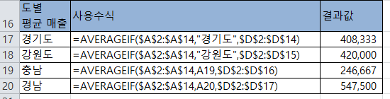 사용수식 =AVERAGEIF($A$2:$A$14,"경기도",$C$2:$C$14) 수식을 주어 결과값 364가 나온다